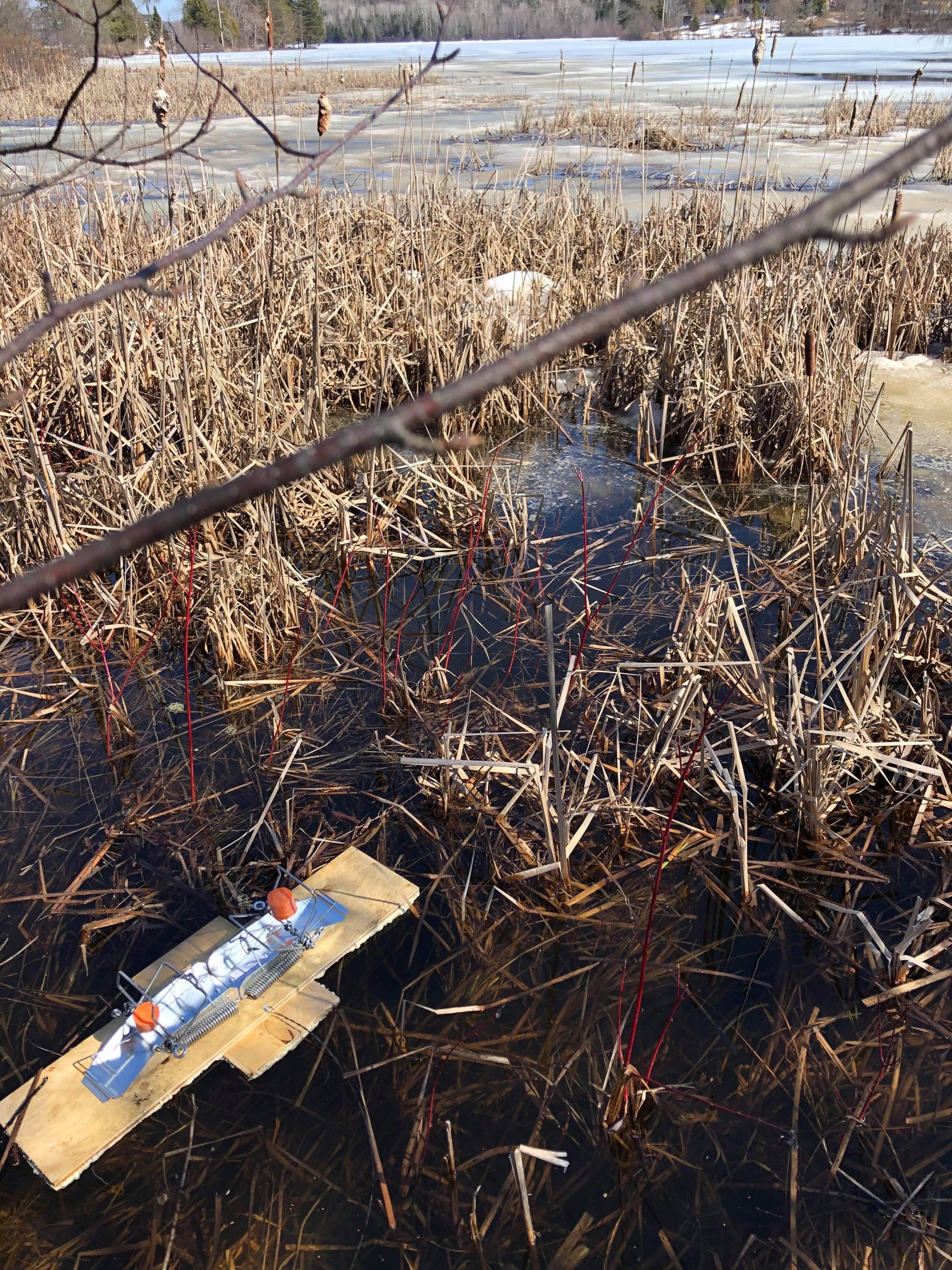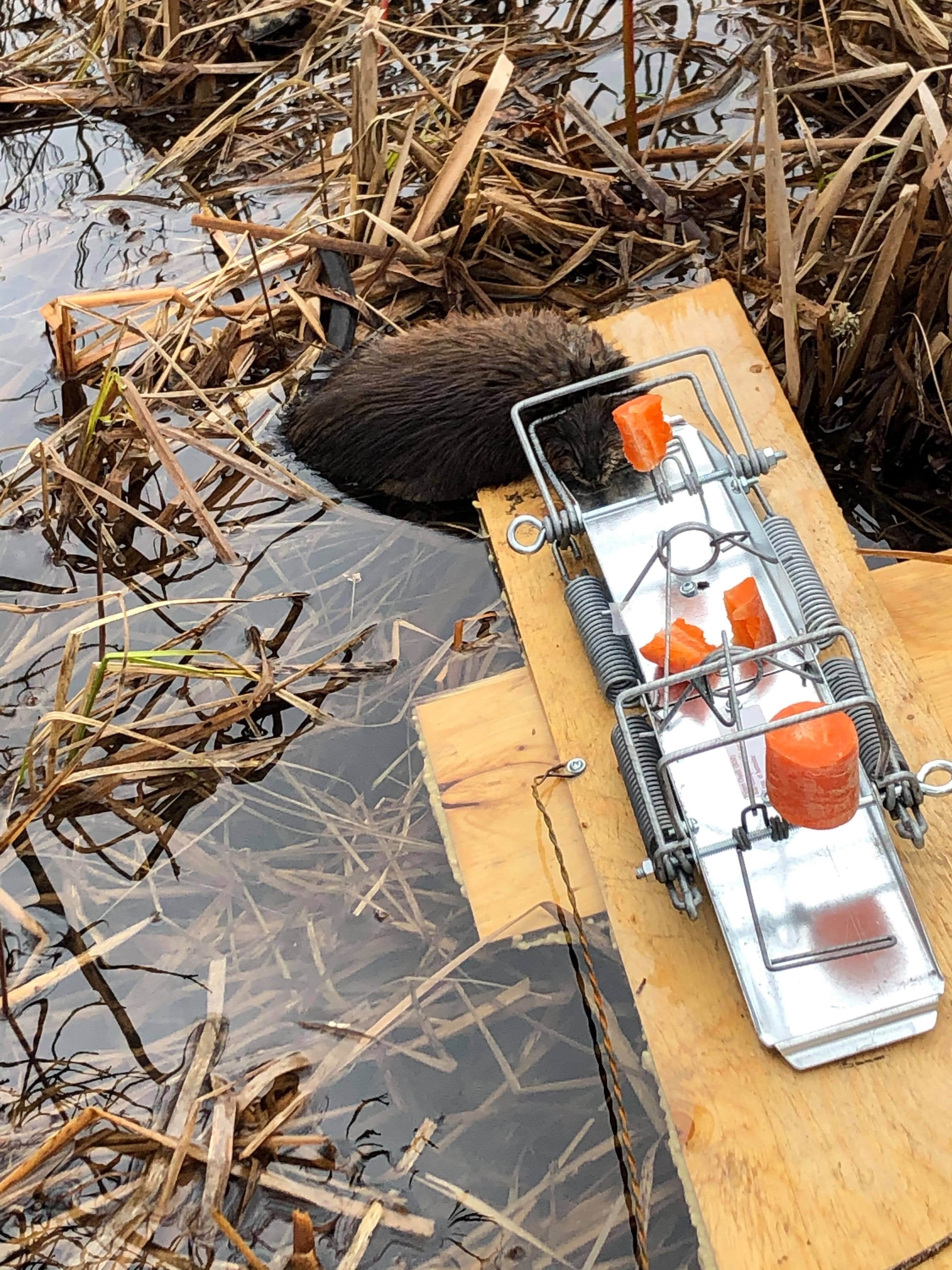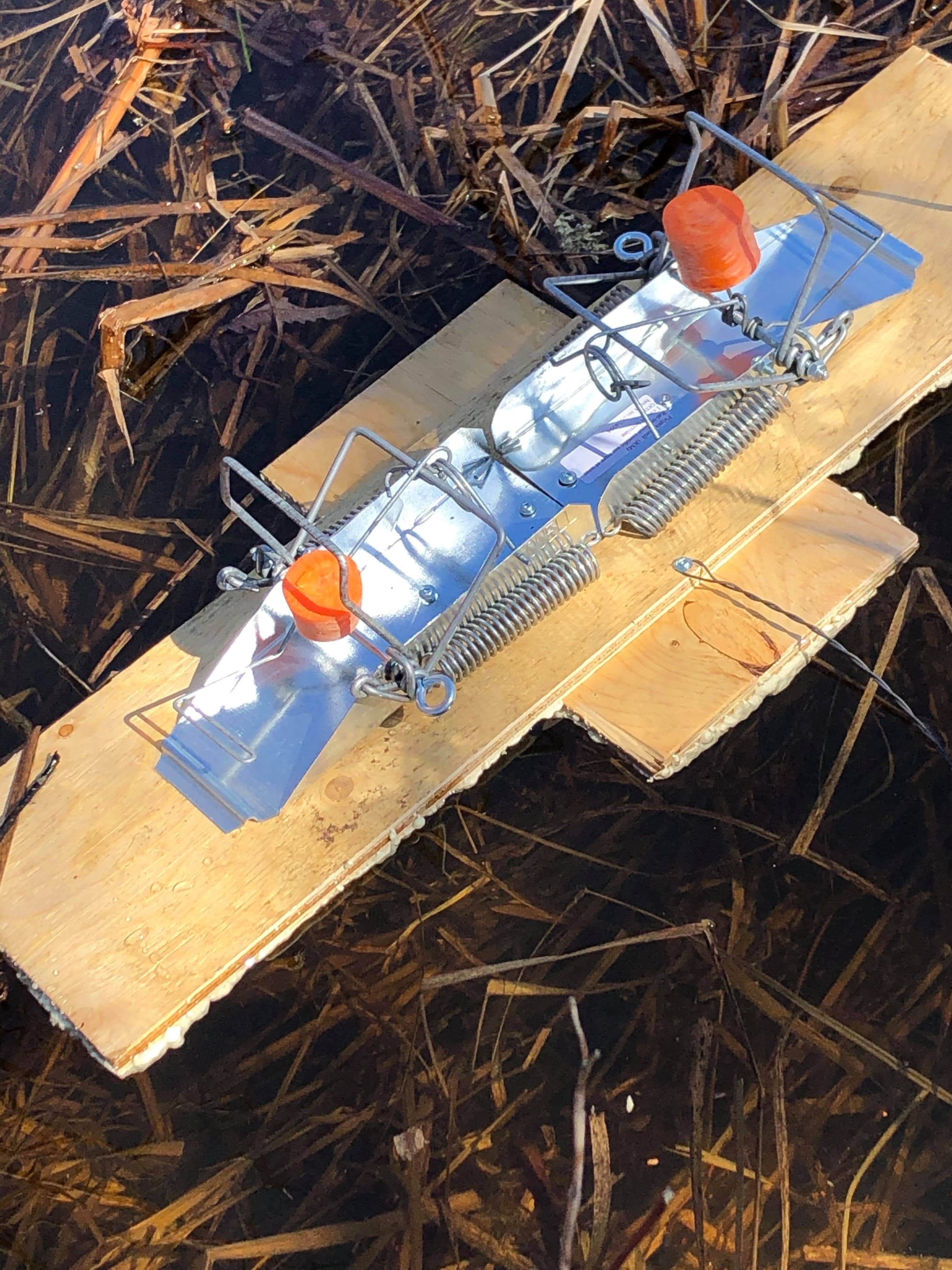 Fabriquer un flotteur artisanal en forme de croix et installer 2 pièges RM dos à dos. Laisser 6 “ entre le début de la planche et le rebord des pièges de façon à ce que le rat musqué soit bien embarqué sur le flotteur avant d’arriver aux pièges. (voir photo) |