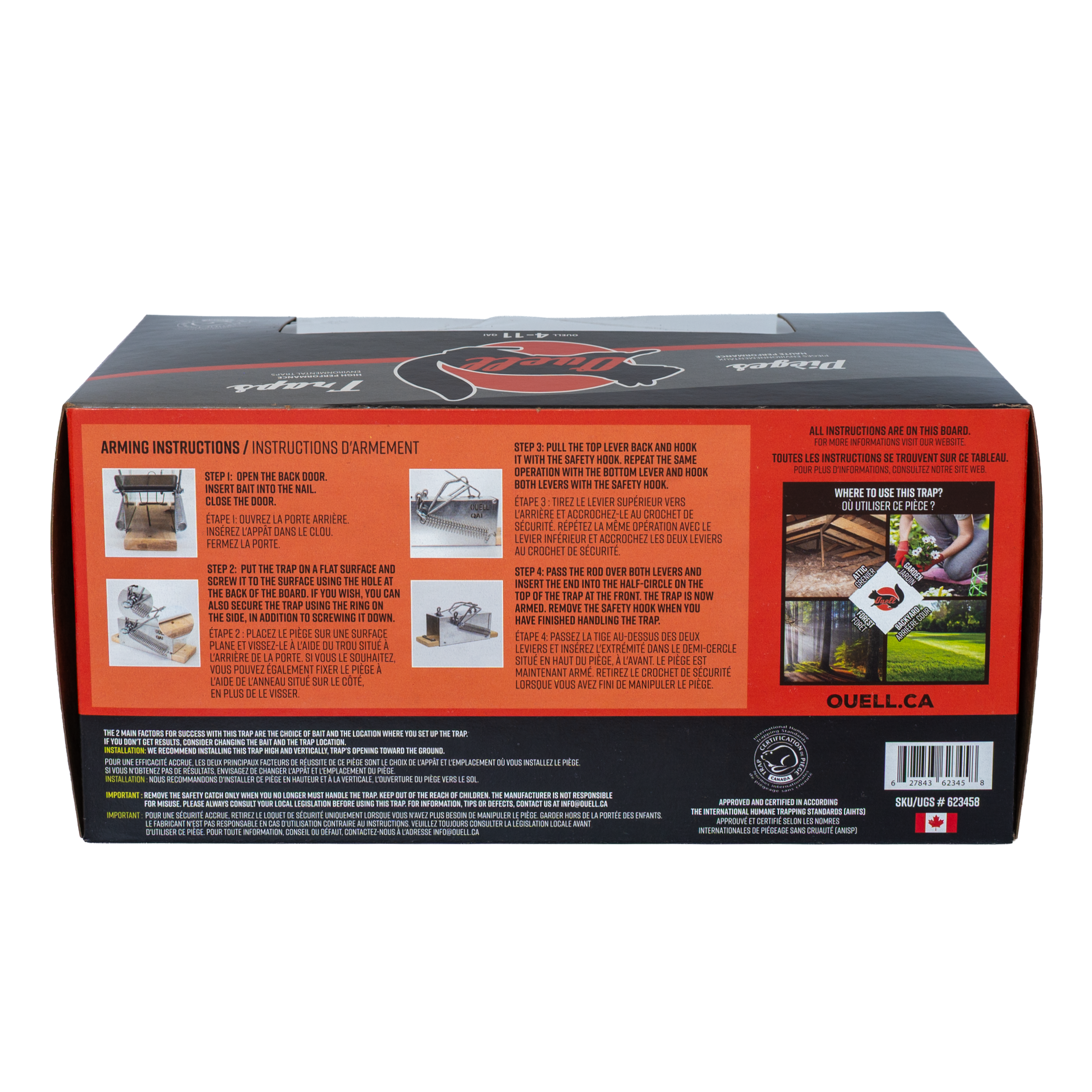 All of our traps are certified and conform to Canadian and International regulations and guidelines in support of the humane trapping of animals, meaning lethal traps do not allow the animal to suffer. Easily dispose of the animal without contact. Ouell Traps are the simple solution to all of your problems.